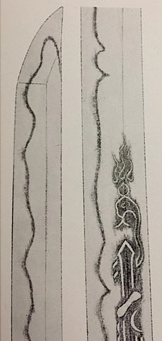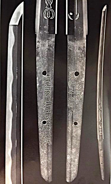 Ikkanshi Tadatsuna was famous for his carvings. His father was also a well-known swordsmith, Omi-no-Kami Tadatsuna (近江守忠綱). Consequently, he was known as Awataguchi Omi-no-Kami Fujiwara Tadatsuna (粟田口近江守藤原忠綱), as shown in the nakago photo above.