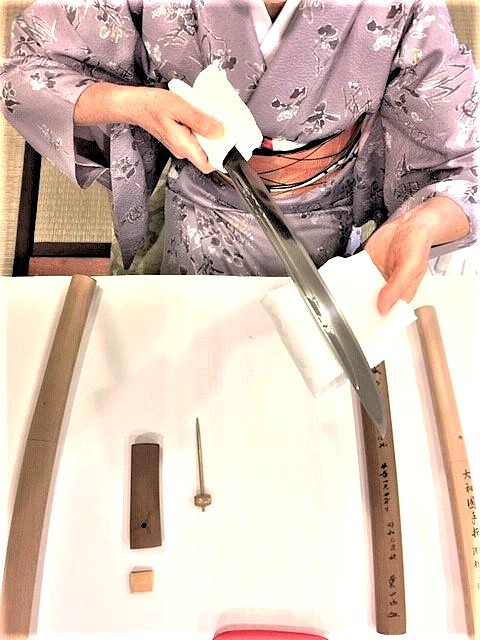 Hold the nakago in your right hand. Support the blade from underneath with your left hand using washi (Japanese rice paper), a handkerchief, or tissue paper.