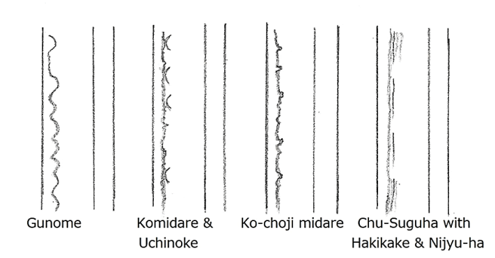 The main features of the Yamatoden style sword are masame (straight grain).  Its tempered line often shows nijyu-ha (double straight lines), hakikake (brush mark trace), uchinoke (a crescent-shaped line), or a combination of these.   See the illustration below.